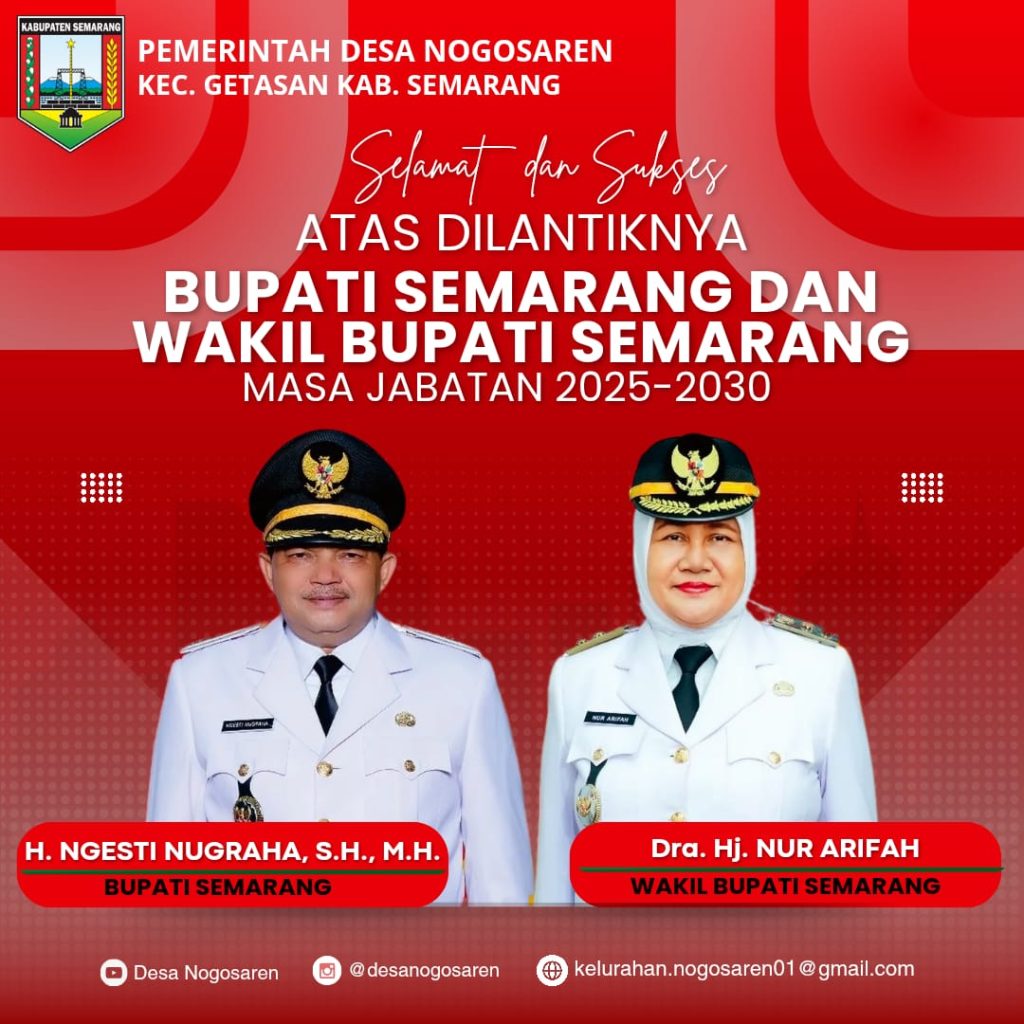 Nogosaren,18 Februari 2025 – H. Ngesti Nugraha, S.H., M.H., dan Dra. Hj. Nur Arifah secara resmi dilantik sebagai Bupati dan Wakil Bupati Semarang periode 2025-2030. Pelantikan tersebut berlangsung di Pendopo Kabupaten Semarang dengan dihadiri oleh jajaran pejabat pemerintah daerah, tokoh masyarakat, serta berbagai perwakilan desa, termasuk Desa Nogosaren, Kecamatan Getasan. Pelantikan ini menandai awal dari […]