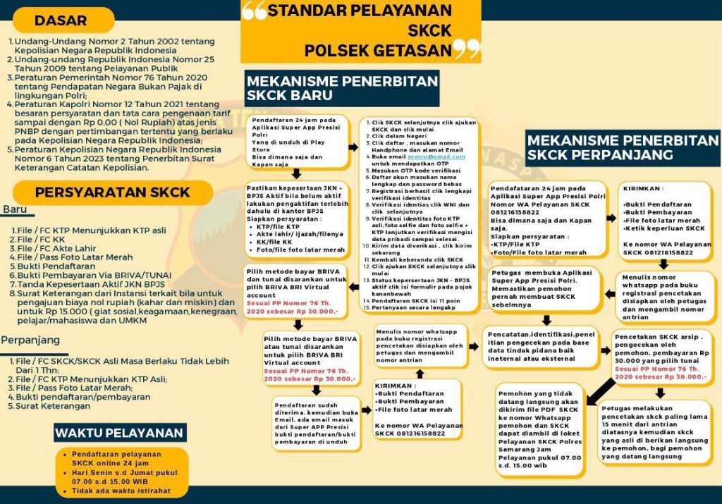 Nogosarenโ Polsek Getasan terus meningkatkan kualitas pelayanan publik, salah satunya dengan mempermudah proses penerbitan dan perpanjangan Surat Keterangan Catatan Kepolisian (SKCK). Kini, masyarakat dapat mengajukan SKCK secara daring melalui aplikasi Super App Presisi Polri yang dapat diunduh dari Play Store maupun App Store. Dasar Hukum dan Kebijakan Layanan ini mengacu pada sejumlah peraturan penting, seperti: […]